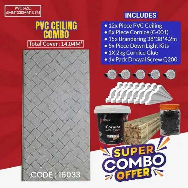 The ceiling decorative pvc PVC Ceiling Combo 16033 provides a complete, ready-to-install package with all panels, brandering, cornices, downlights, glue, and screws included. Upgrade your interior with a stylish, durable, and low-maintenance ceiling that lasts for years.