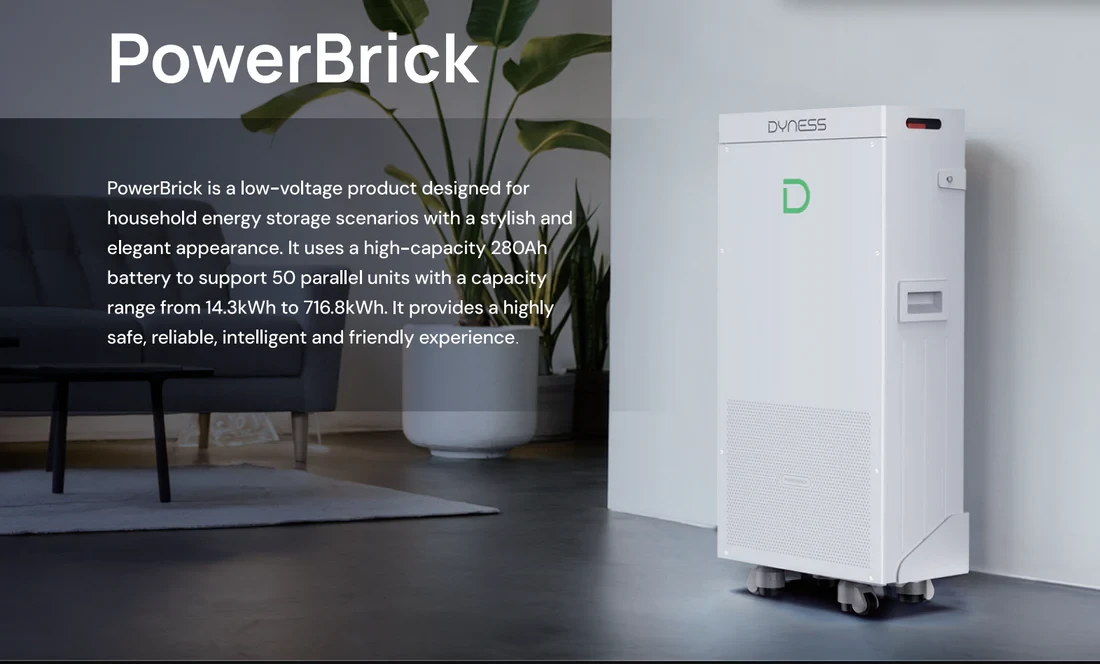 The Dyness PowerBrick 14.3kWh Power Brick battery is a premium LiFePO₄ energy storage solution designed for residential solar and backup power systems. Combining high capacity, long lifespan, and smart integrated management, this Power Brick battery ensures reliable energy performance and advanced monitoring through a built-in Wi-Fi module. Ideal for large off-grid homes or hybrid systems, it can be scaled up to 50 parallel units, reaching up to 716.8 kWh total energy storage.