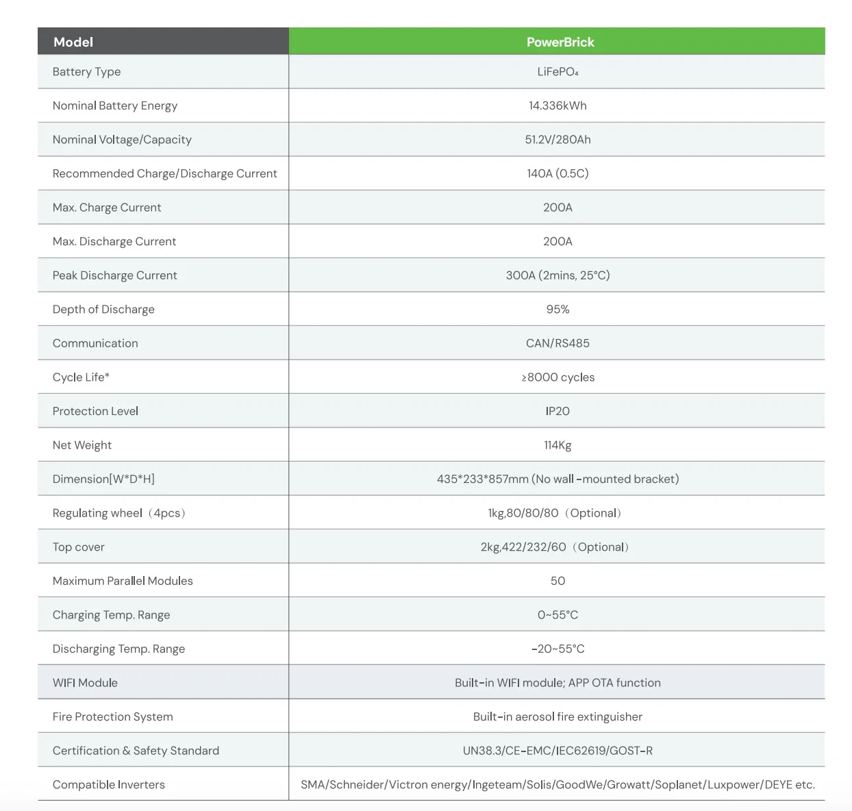 With a continuous discharge current of 200A and 95% depth of discharge, the Power Brick battery delivers dependable high-power output for demanding residential energy setups. Its compact and lightweight design also makes installation fast and efficient.