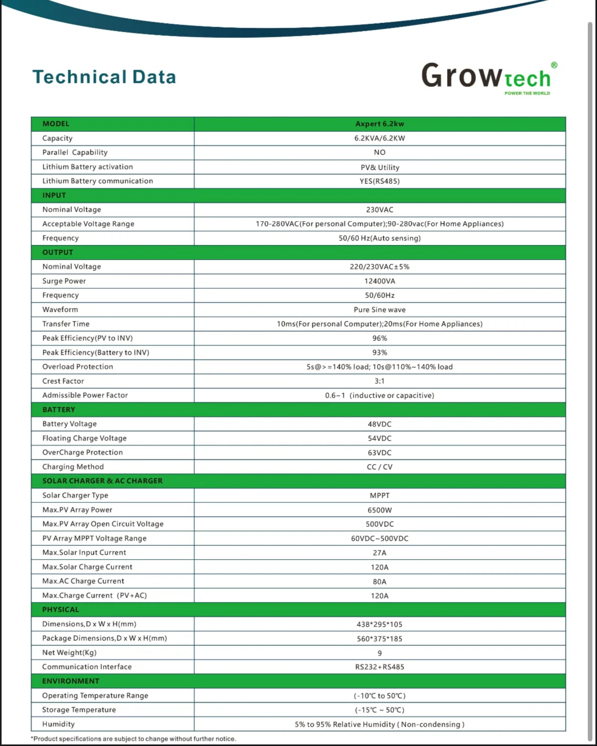 Looking for a reliable and high-performance energy solution? The GroWtech Axpert 6.2kW Pure Sine Wave Inverter is your ultimate choice. Perfect for both residential and small commercial setups, this inverter ensures uninterrupted power with smart solar and battery integration. Available now in our power inverter sale, it combines efficiency, durability, and advanced technology for seamless energy management.