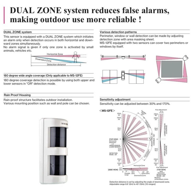 A major issue when using outdoor PIR sensors is the unwanted activations triggered by animals, both wild and household. To address this, TAKEX has designed the 'Dual-Zone' PIR sensors, which integrate a horizontal curtain and a downward curtain. Both zones must be triggered at the same time for an alarm to sound. With an impressive range of up to 180˚ and covering 12 meters, these sensors are ideal for residential and industrial use. They are also pet-friendly. .