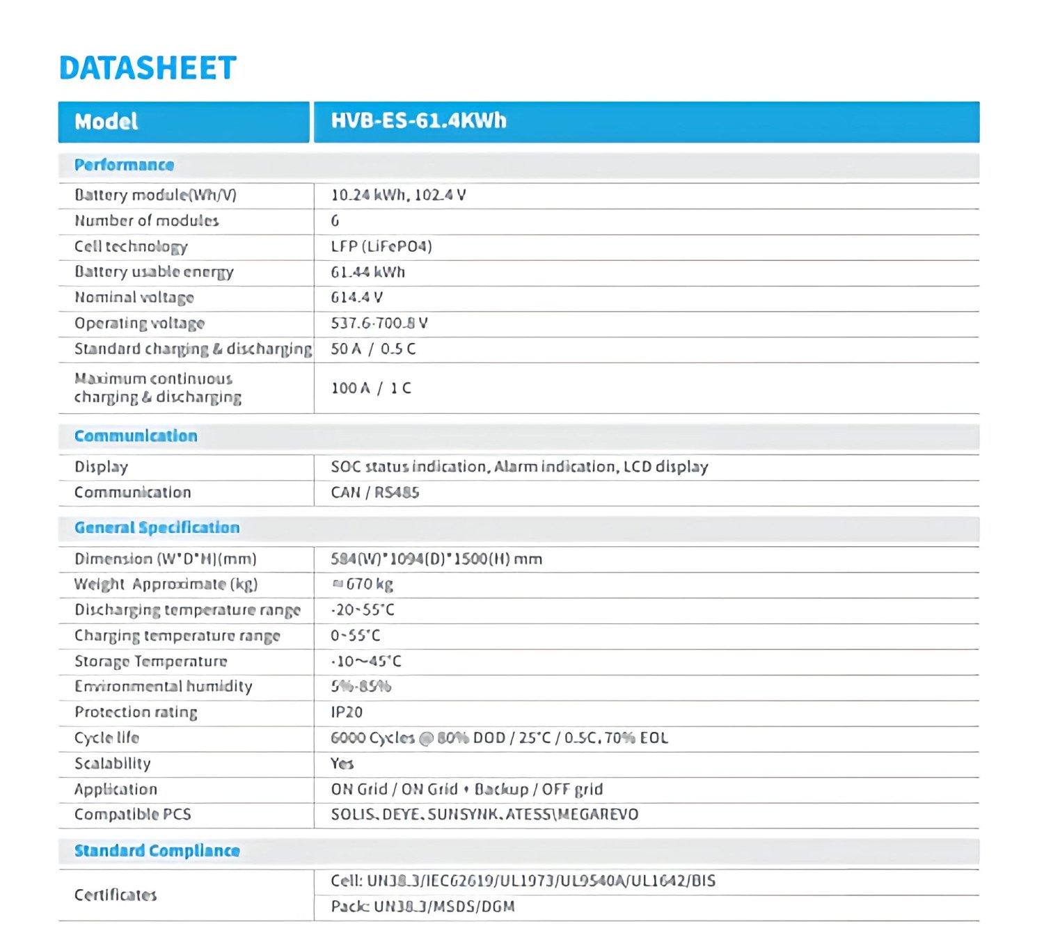 This air-cooleds battery system offers 61.4kWh of total energy, ideal for off-grid solar projects, industrial sites, and large-scale renewable energy applications. Its modular design allows flexible scaling for growing energy requirements.