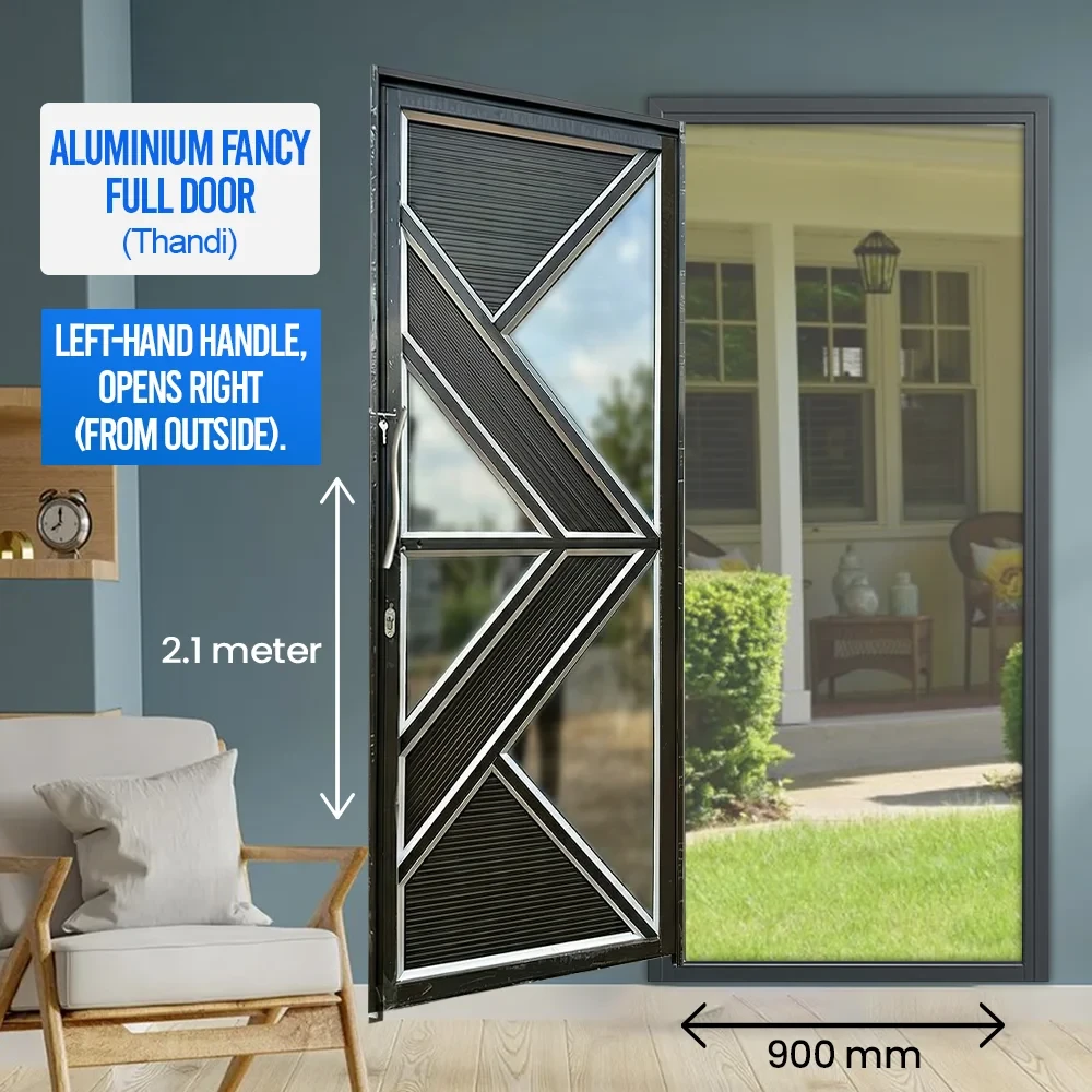 This Aluminium Custom Door features a solid full-panel construction that delivers a clean, contemporary appearance while ensuring maximum privacy and security. The signature Thandi Fancy design enhances curb appeal with subtle architectural detailing, making it ideal for modern homes, apartments, and commercial entrances.