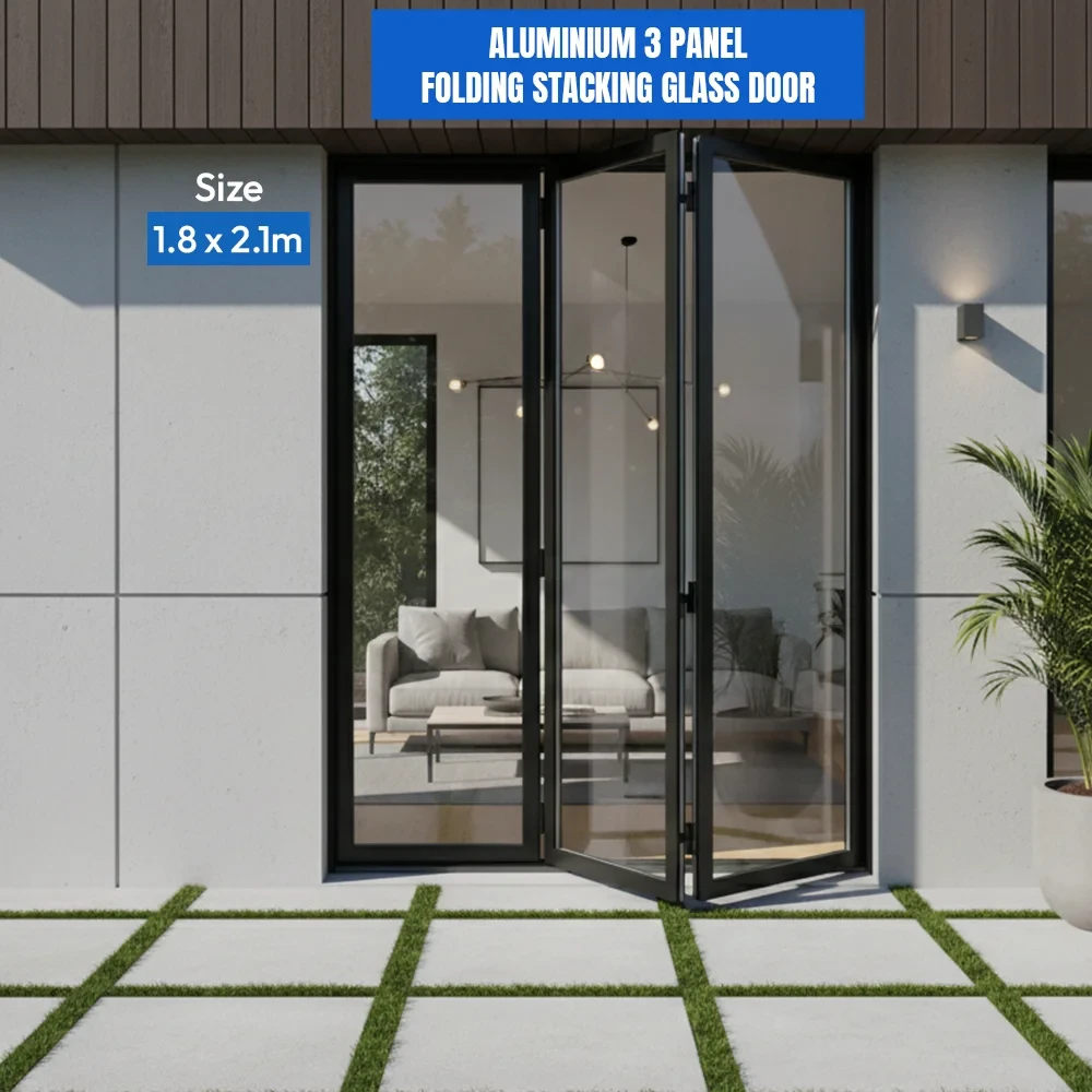 Maximized Opening: The Aluminium Folding Doors feature three full-height glass panels that fold and stack neatly to one side, opening up to 1.8 meters in width. This creates an unobstructed view and access, making it perfect for large openings like patios and balconies.