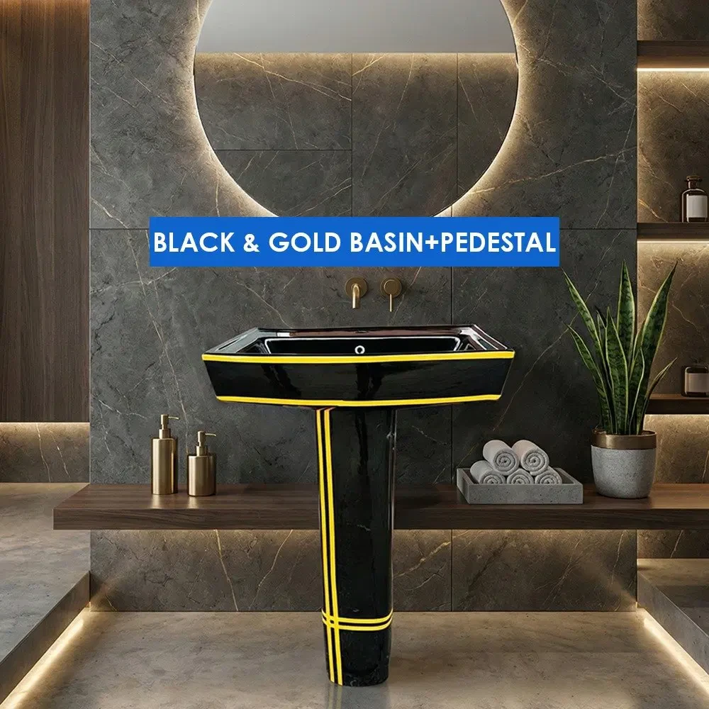 Transform your bathroom with our Black gold basin with pedestal, a striking combination of bold black tones and elegant gold accents. Designed for luxury modern interiors, this basin set delivers premium style, durability, and everyday convenience—perfect for both residential and commercial spaces.