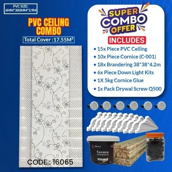 Upgrade your space with our high-quality ceiling covering panels! The PVC Ceiling Combo 1755 16065 is designed to provide a stylish, durable, and practical solution for residential and commercial interiors. Perfect for living rooms, offices, kitchens, and bathrooms, this combo delivers a seamless, modern ceiling finish.
