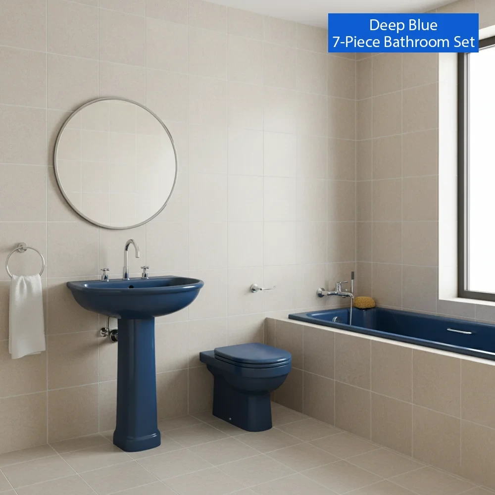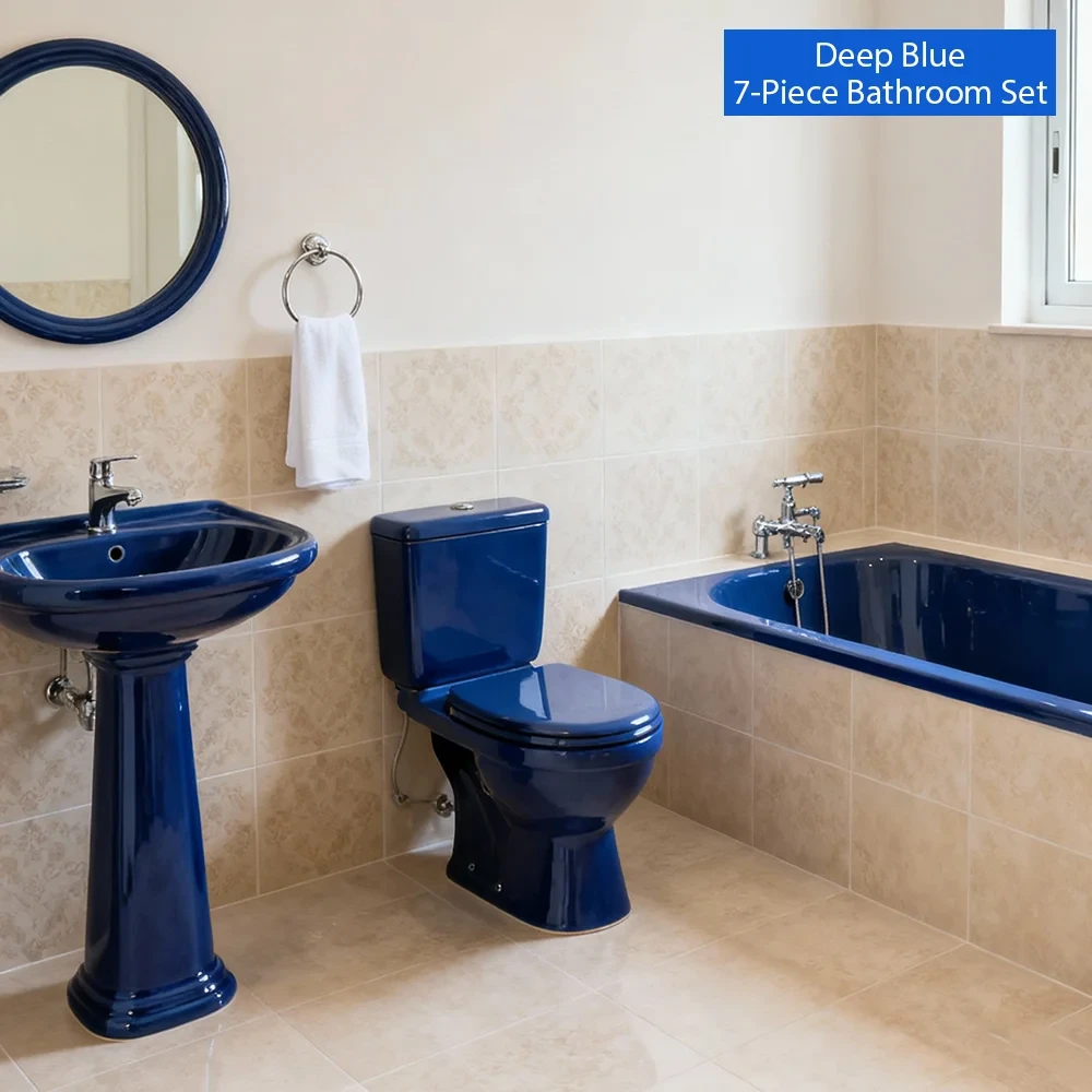 Complete Coordinated Set: This 7-piece set includes all the essential components for your bathroom: the toilet pan, cistern, toilet seat, basin, pedestal, and essential accessories. No need to worry about mixing and matching — this Deep Blue Bathroom Set ensures a perfectly coordinated, seamless design.