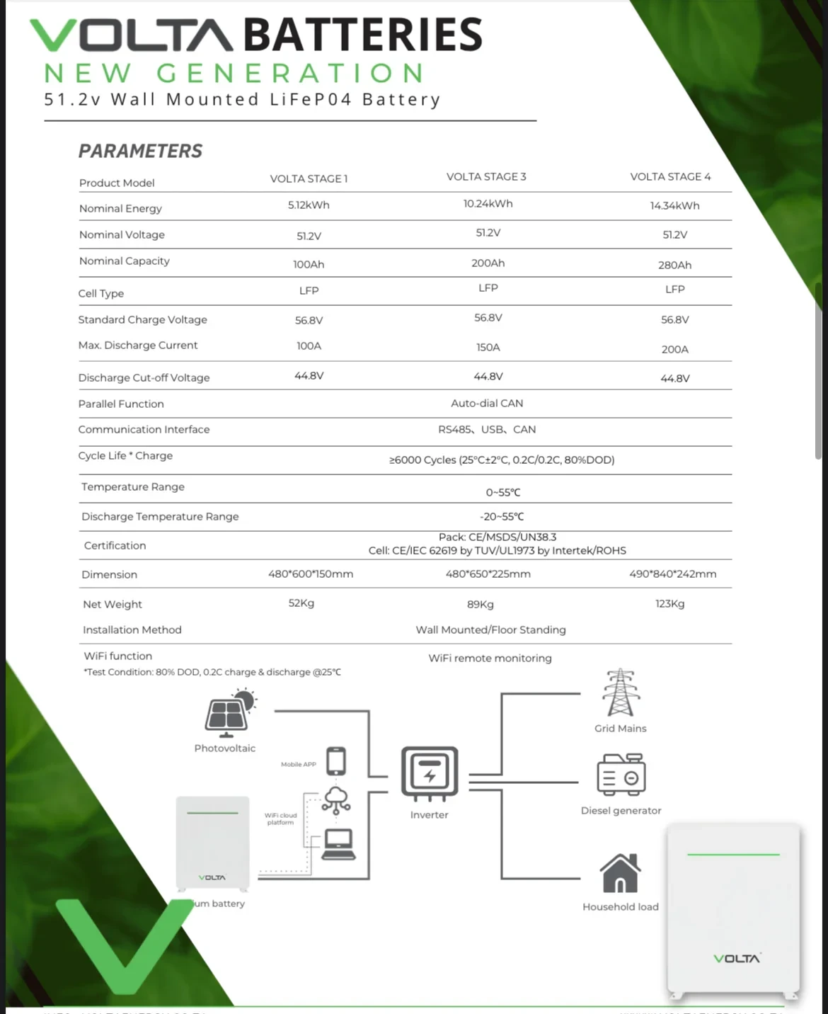 With a nominal voltage of 51.2V and 200Ah capacity, this VOLTA STAGE 3 energy storage battery provides dependable power for multiple inverter brands. Its prismatic LiFePO4 cells ensure low internal resistance, high current support, and excellent durability.
