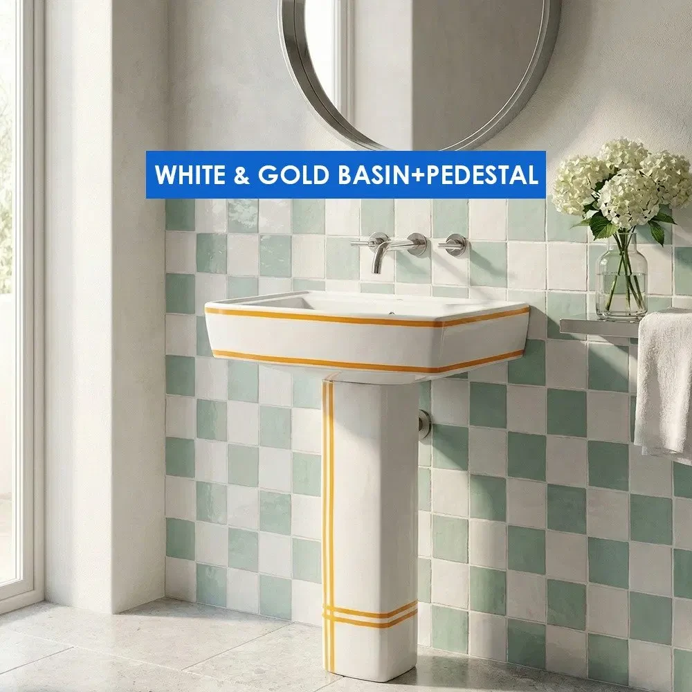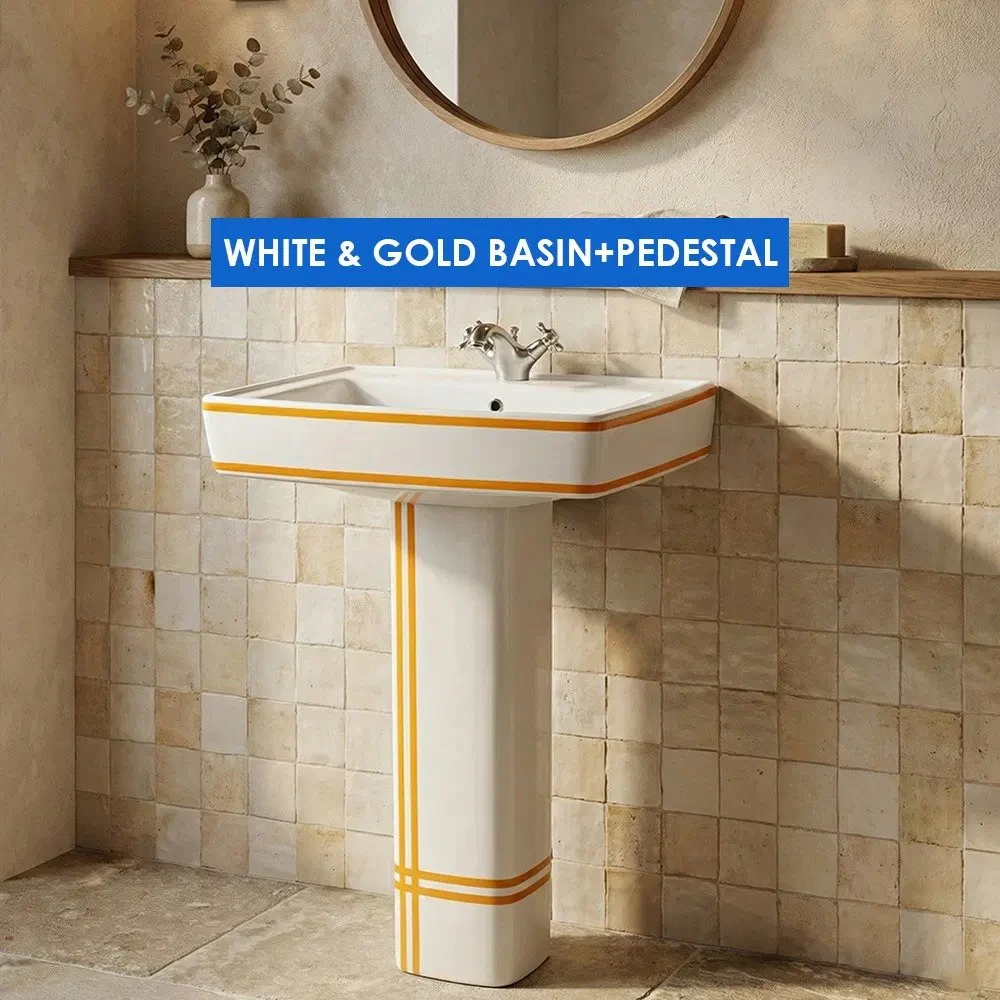 Upgrade your bathroom with our White gold basin with pedestal, a perfect blend of modern luxury and everyday practicality. Designed for elegant interiors, this basin set features a premium glossy white finish with refined gold accents, adding a sophisticated statement to any bathroom space.